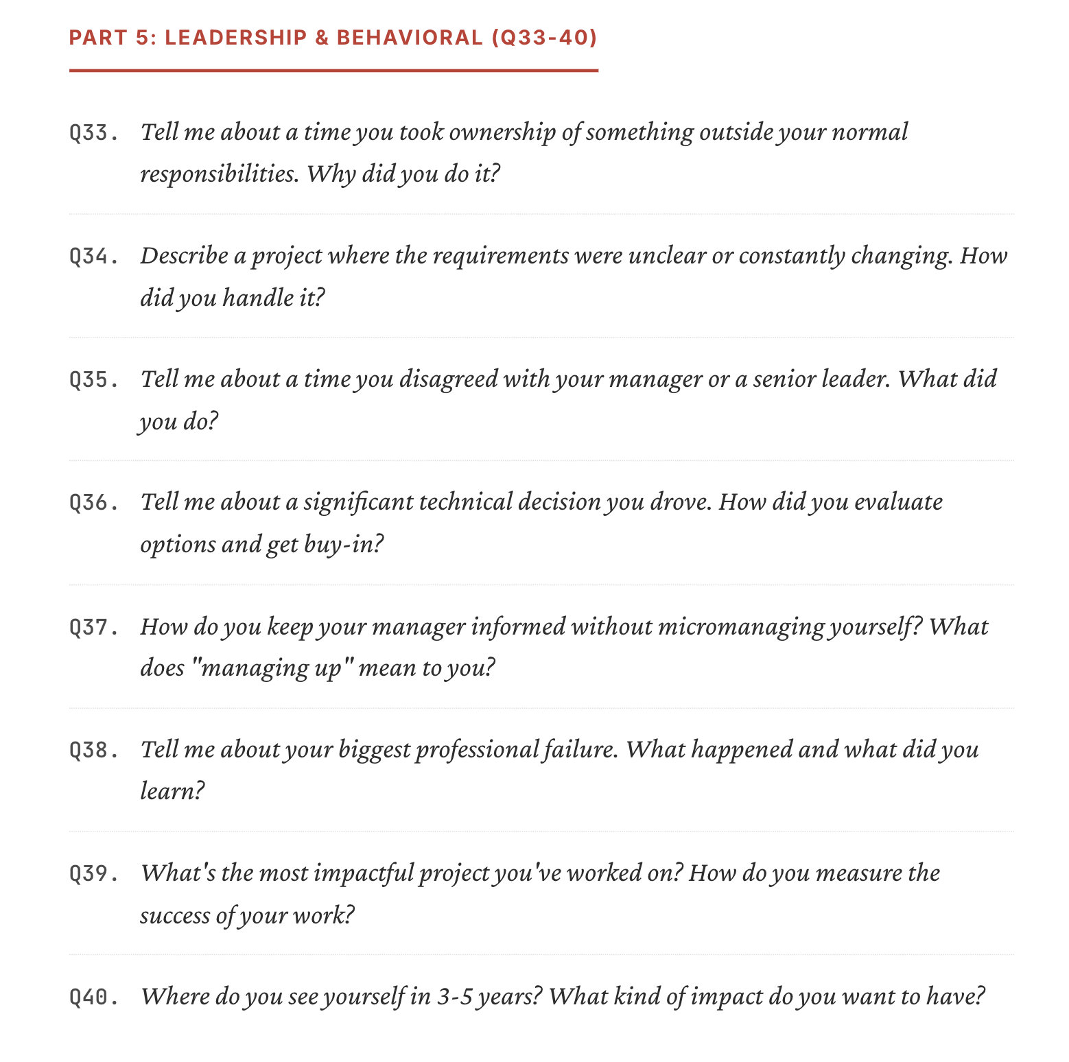 - Leadership & behavioral situations (mentoring, feedback, disagreement, failure, decision-making)